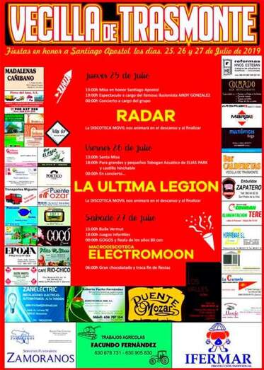 Los vecinos de Vecilla de Trasmonte celebran los festejos patronales en honor a Santiago Apóstol desde este jueves 25 de julio al próximo sábado 27. Con la misa al patrón, prevista a las 13:00 horas, se abre la programación que continua en la tarde de la jornada festiva local con el espectáculo del ilusionista Andy González y la verbena con el grupo "Radar".