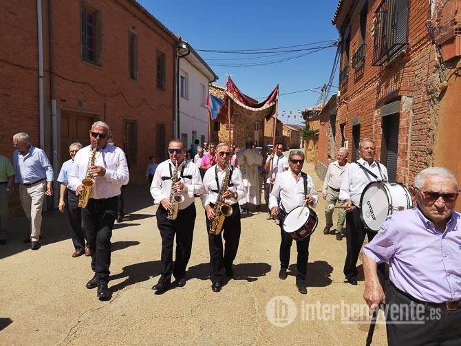 Ya en el exterior se preparaba el desfile procesional con la Custodia mientras la charanga Solera comenzaba a interpretar su repertorio de temas religiosos. Y los vecinos iniciaban la comitiva por las calles de Villaferrueña bajo un sol de justicia enfilando la calle del caño del molino, la paralela al ahora seco cauce del río Eria.
