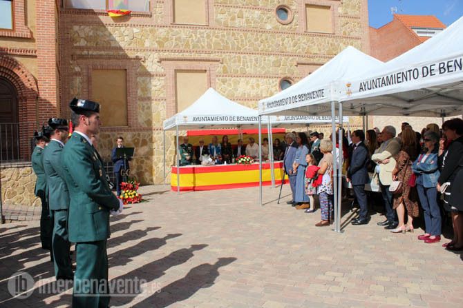 Tras el himno nacional que servía de apertura a este acto, en el que estuvieron presentes el Alcalde y los concejales de la Corporación Municipal y también alcaldes de la comarca, se procedió a la condecoración de tres Guardias Civiles del Puesto de Benavente. El primero de ellos fue el Comandante Jesús Ángel Vega que recibía la Cruz del Mérito Militar con Distintivo Blanco. El segundo el Brigada Julián Dominguez que fue condecorado con la Real y Militar Orden de San Hermenegildo en su categoría de Encomienda y por último la Guardia Civil María del Mar Rábano recibía la Cruz al mérito de la Guardia Civil con distintivo blanco.