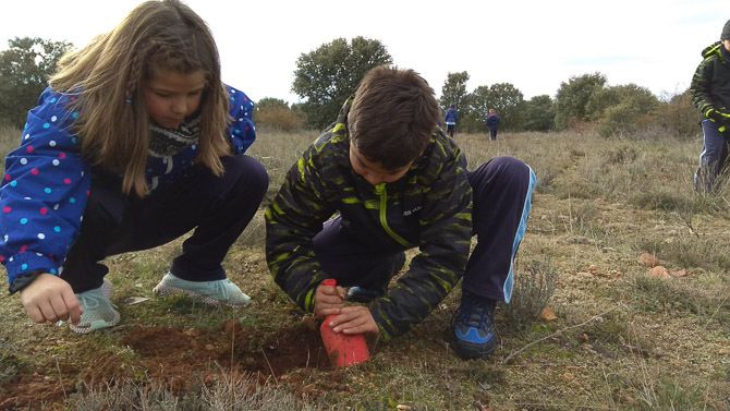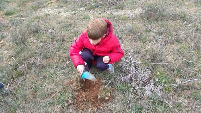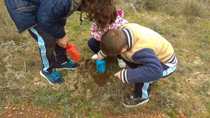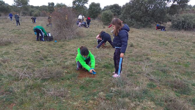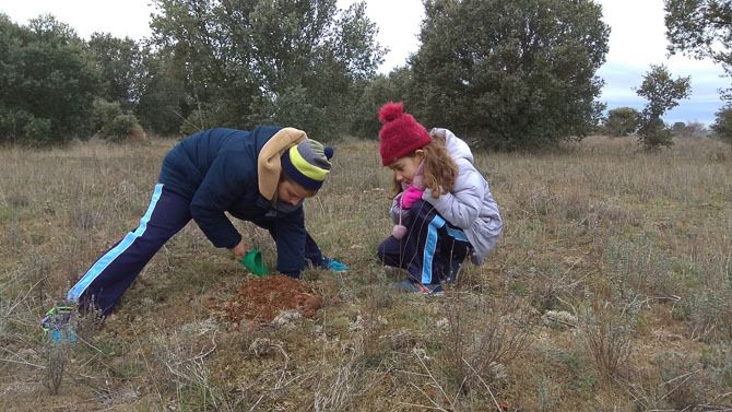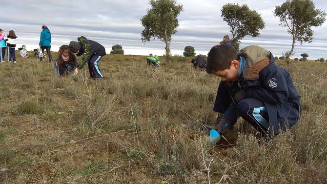 Los alumnos han germinado en clase bellotas y el pasado jueves día 5, en el término municipal de La Torre del Valle y con el permiso de su Ayuntamiento cada alumno ha plantado varias bellotas.
