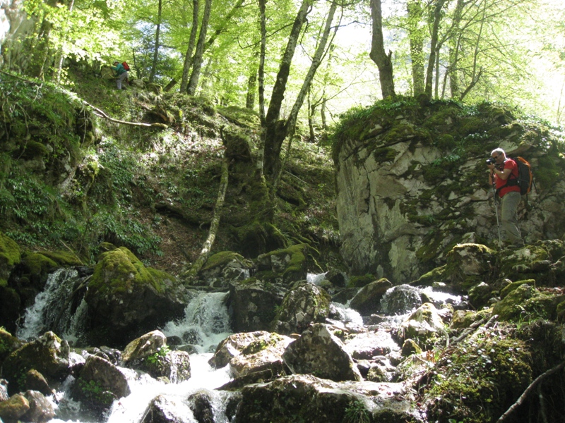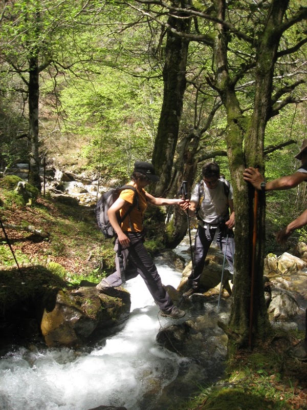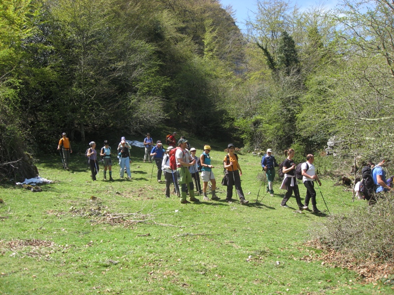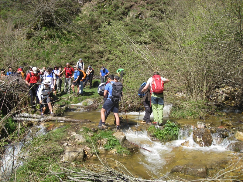 A  continuación  bajamos  por senda entre hayas y acebos por  el  valle  del  Río  Llaímo  para  cambiar  pronto  al  del  Alba,  por  la  Riega  la  Vegona. En esta zona aprovechamos para almorzar, disfrutando de un día buenisimo y de unas vistas espectaculares.  Seguimos el descenso hasta  la  Cruz  los  Ríos por una pendiente entre grandes hayas, donde  confluyen  los  cauces  de  Llaímo,  Alba  y  Tronquiellín.  Cruzamos otra vez el cauce y ya por pendientes mas suaves para llegar a   la  popular  Senda  del  Alba,  que  por  un  estrecho  desfiladero  nos  llevó  entre  pozas  y  cascadas  a  Soto  de  Agües.