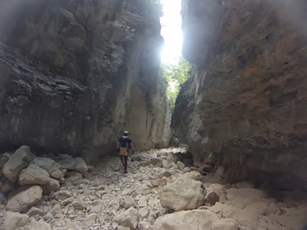Continuamos andando, en seco sin ningún problema, ya que es andar sobre lecho rocoso,  para al poco nos encontramos con la primera dificultad, que con agua debe ser un pequeño salto, en nuestro caso es el R1 8 m. (dcha) 1 parabolt con anilla. Lo que seria un simple resalte o salto a una profunda poza se convierte en un rapel a un pasillo de unos 12-15 m. de roca pulida.