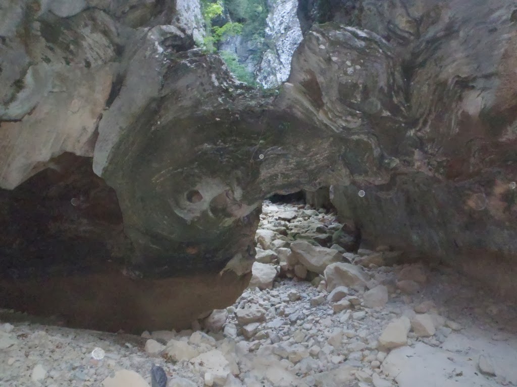 Continuamos por una lar zona de andar por un apasillo estrecho con varios puentes de roca de formación Toba. El barranco se abre un poco y pasamos por el único escape que tiene, una pedrera de fuerte pendiente a nuestra derecha.