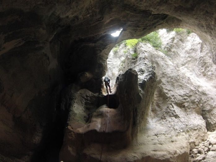 R3 17 m. (izq) químicos. Bonito rapel a una gran sala abovedada.