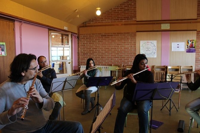 Hoy la jornada se ha divido en dos partes Por la mañana ensaya la gran orquesta de flautas compuesta por los profesores de la orquesta de flautas de León y alumnos de diversas escuelas y conservatorios. Entre estos alumnos están los alumnos de flauta de la escuela. Por las tardes ensaya la orquesta profesional de flautas.