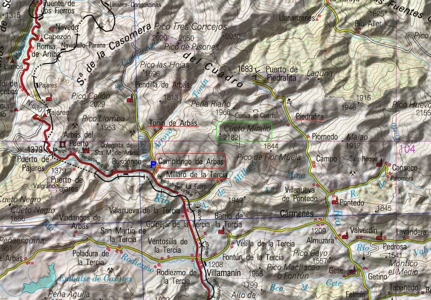 Desde aquí es visible ya la cima del Brañacaballo y únicamente hay que seguir el cordal Oeste hasta llegar a la cumbre. Nosotros buscamos las zonas con mas nieve y menos pendiente (marcado en el plano en rojo), pasando por el paraje del Picarillo y Valdemenan, hasta el Brañacaballo o Cueto Miralló (2.182 m.)