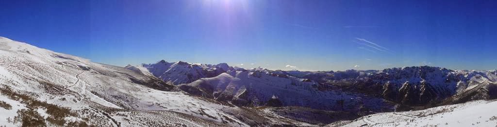 Las vistas desde aquí en un día claro como el que pillamos son impresionantes, y aún más al estar nevadas todas las cumbres de la Cordillera, dándote cuenta de su inmensidad. Es visible, hacia el Oeste el Teleno y la Cabrera, el Macizo de las Ubiñas, destacando la vertiente Sur de Peña Ubiña, las Peñas del Prado, el Pico Cellón, hacia el norte el Pico de la Carba, el Estorbin y la Peña Cuaña, hacia el oeste en primer plano el Huevo, el Faro, El Bodón, el Correcillas, Los Mampodres, y hacia el horizonte los picos de Europa y la Montaña Palentina y hacia el Sur el Fontún.