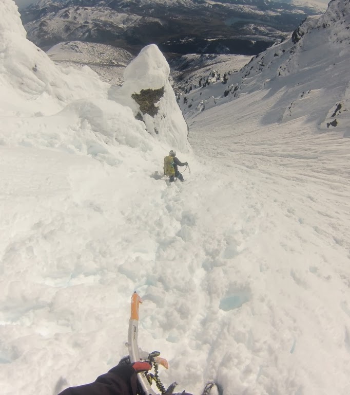 Pero todavía nos queda el DESCENSO, en el que nos tememos que va a estar muy peligroso por las altas temperaturas y la cantidad de nieve acumulada y pegada a las paredes. Un paisaje Patagónico, con grandes cornisas y hongos de nieve merengue.