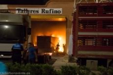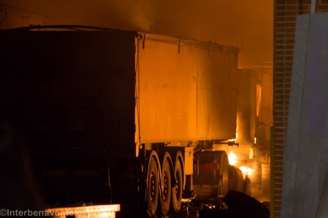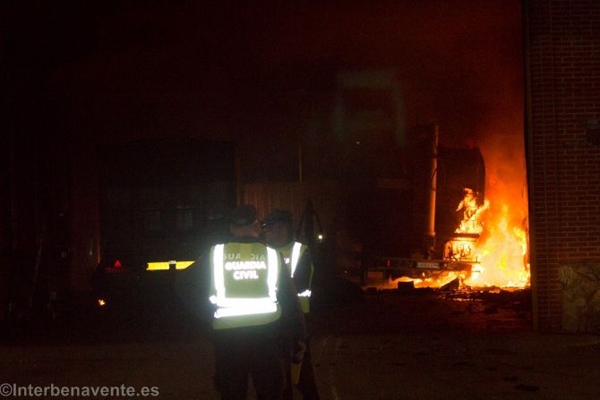 Cinco camiones ardían mientras los bomberos intentaban controlar el fuego producido en la nave, y que como resultado provocó una gran columna de humo visible tras caer parte del tejado. También acudió una dotación de bomberos de Rionegro, que no tuvieron que actuar al estar el fuego practicamente extinguido.