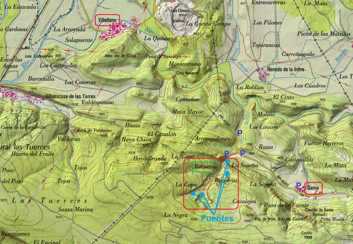 Desde la rotonda del Polígono Industrial tomamos dirección Gama y Villallano por la PP-6201, tras una larga recta, pegados a la nueva fabrica de SIRO, pasamos por encima de la A-62, de la línea de ferrocarril y del rio Camesa, para llegar a Villallano. Para cruzar esta localidad es recomendable tomas la primera calle a la derecha y seguir por la carretera (también se puede cruzar por las calles mas estrechas por el centro de la localidad). Continuamos por la en dirección a Gama, sin llegar a esta localidad, 1 Km antes, nos encontraremos con una señal de prohibido aparcar y un contenedor, justo en el camino de acceso a Recuevas.