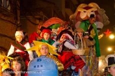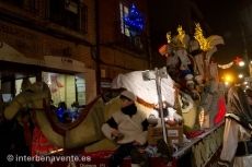 Cuatro carrozas eran las que componían la noche de la ilusión en Benavente, la primera parte de la cabalgata estaba amenizada por la Banda de Música Maestro Lupi a los que le seguían los scouts de Benavente subidos en zancos y haciendo malabares, a continuación aparecieron dulzainas y tambores y la banda de cornetas, tras ellos dos burros zamoranos para dar paso a continuación a la primera de las carrozas que simbolizaba una bailarina dentro de una bola de cristal a la que debería haber acompañado un violinista,  mientras tres músicos de la Banda Municipal tocaban partituras navideñas. Un coche y una moto de correos acompañaban la comitiva simbolizando la recogida de cartas de los niños a los Reyes Magos.