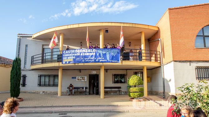 A las ocho de la tarde, el alcalde Joaquín García Neches, acompañado de cinco miembros de la peña "El botellón" hicieron su aparicien en el balcón consistorial, presidido en esta ocasión por una gran pancarta en la que se podía leer "Castrogonzalo, comenzamos a caminar sin miedo. Por la igualdad y contra la violencia de género", ilustrada con un dibujo del artista local Parsec en homenaje a Leticia Rosino.