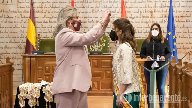 Las circunstancias epidemiológicas han impedido celebrar el acto de coronación e imposición de bandas de las Representantes de la Juventud y de la Infancia como es tradicional en el Teatro Reina Sofía y ha sido en el Salón de Plenos de Plaza Mayor el lugar donde se ha cedlebrado una recogida celebración en la que se ha desvelado el contenido del acta notarial en el que se daba a conocer el nombre de la Reina de las Fiestas elegido mediante sorteo el pasado 6 de marzo del año 2020.
