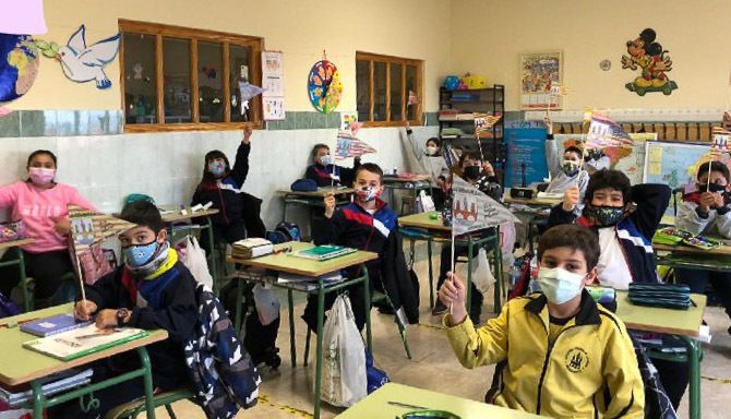 Los escolares de infantil y primaria han querido celebrar nuestras fiestas patronales en el interior de sus aulas con diversas tareas, entre las que se incluyen la elaboración de vistosas guirnaldas y banderines con los que han decorado sus instalaciones.