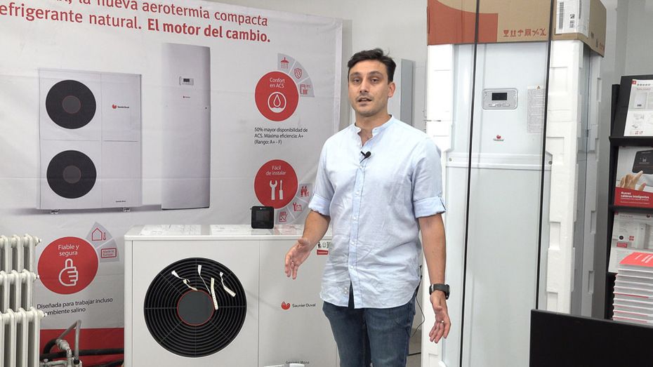 Pablo Benavides Abella, Tecnico comercial Saunier Duval explica el funcionamiento de los equipos de aerotermia de Saunier Duval, que podrán verse funcionando en las instalaciones de Biomaser los días 15 y 16 de junio