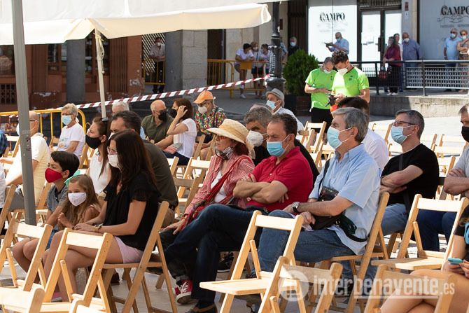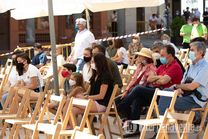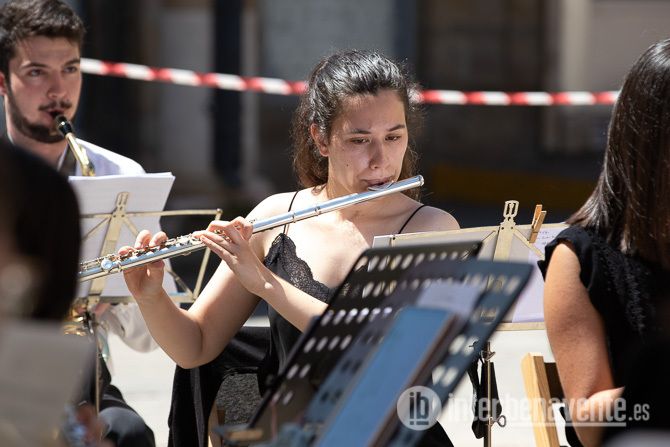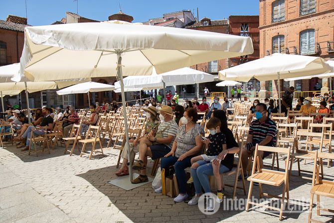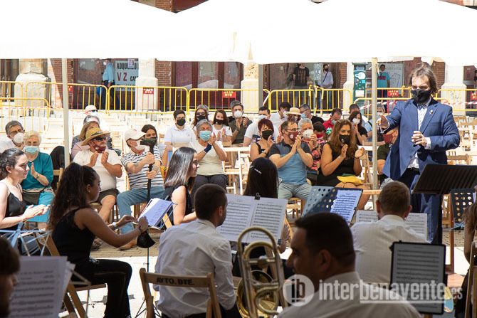 La Plaza Mayor acogía pasadas las 12:00 del mediodía a la Banda de Música de Zamora ante un tímido público que a medida que avanzaba la actuación ocupaba los asientos dispuestos en el lugar, un máximo de 300 sillas para garantizar la distancia de seguridad, con la protección solar de varias sombrillas de grandes dimensiones.