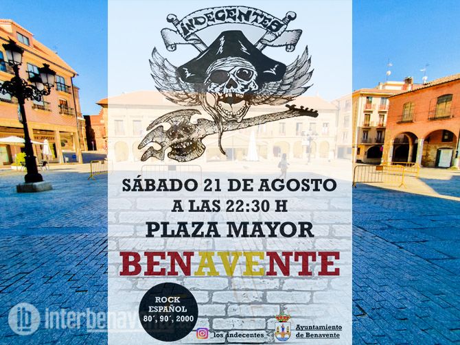 El Ayuntamiento de Benavente, desde sus Concejalías de Juventud y Cultura, informa que el próximo sábado 21 de agosto tendrá lugar un concierto en la Plaza Mayor de Benavente a cargo del grupo “Los indecentes” a partir de las 22:30 horas.
