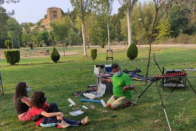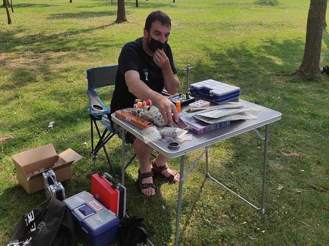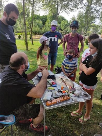 Un grupo de diez niños pudieron disfrutar de las explicaciones y demostraciones de los deportistas que mostraron sus habilidades en distintas modalidades tales como la pesca de salmónidos, con una exhibición de pesca a látigo, así como la realización por los especialistas del montaje in situ de varias imitaciones de insectos como los que se utilizan para reclamo en sus anzuelos y la exposición de los vistosos materiales como pelo y plumas de animales y otros vistosos elementos artificiales que se utilizan para la confección de los mismos.