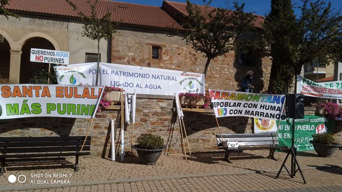 Nos concentramos en Faramontanos porque las máquinas han vuelto a la parcela en la que se prevé construir la macrogranja. Han vuelto para intentar vaciar la balsa, que contiene miles de litros de agua estancada, y en la que hay juncos y hasta vida animal. Les va a costar mucho vaciar la balsa porque no solo contiene agua de lluvia acumulada a lo largo de estos meses sino también agua de la que mana del subsuelo. Y, como hemos dicho en otras ocasiones, igual que el agua mana, se filtrará en su momento toda la porquería que genere la macrogranja, con riesgo para el acuífiero del que bebe Santa Eulalia.