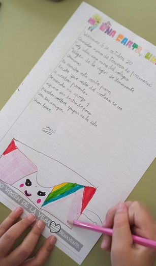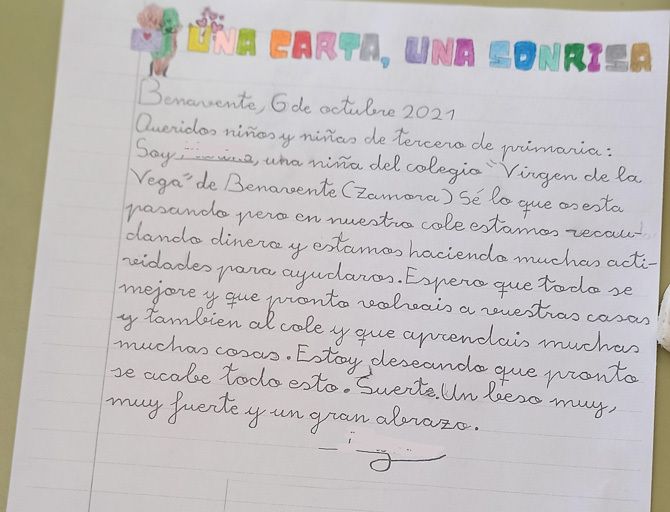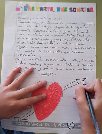 - Una carta, una sonrisa: esta propuesta del docente canario Felipe Brito Luis ha tenido muy buena aceptación en el colegio y no han sido pocos los alumnos que han redactado cartas, dibujos, collages… como muestra de ánimo a sus compañeros de La Palma que, una vez reanudadas las clases, sentirán el calor y afecto de muchos escolares de toda España en forma de palabras de ánimo.
