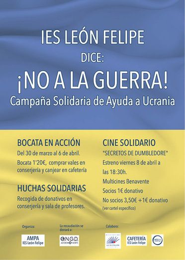 Desde ayer miércoles han activado el programa “Bocata en acción”, en colaboración con la cafetería del centro, que donará una parte de la recaudación de los bocatas, además se han situado huchas en distintos lugares del instituto para que todos los alumnos puedan colaborar. Además tienen previsto asistir al estreno de una película el próximo día 6 de abril en Multicines Benavente que será gratuita para los alumnos socios del AMPA, aunque en esta función todos los asistente, socios y no socios, contribuirán con un donativo de un euro destinados al objetivo de esta campaña.