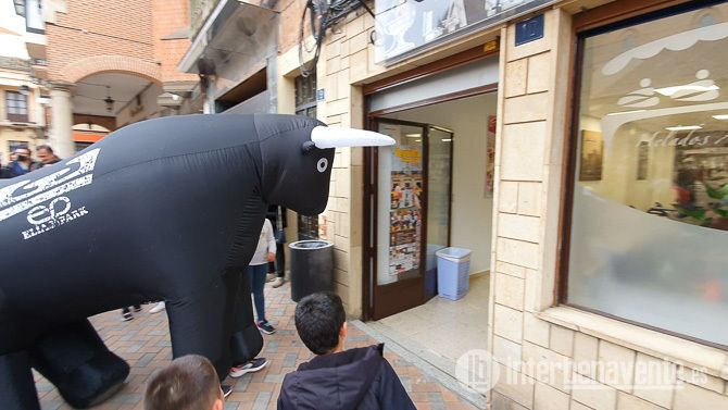 Dos toros del encierro de Toros Hinchables de la Asociación del Toro Enmaromado de Benavente entran en la heladería La Ibense en su recorrido por las calles de la ciudad