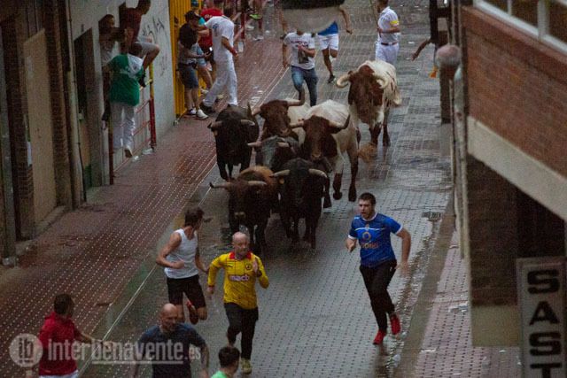 En la segunda suelta y ya con la tormenta sobre Benavente los novillos recorrían el itinerario con los pocos corredores que decidieron acompañar a los astados bajo la intensa lluvia.