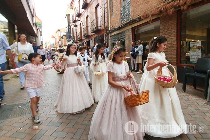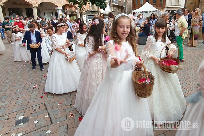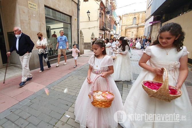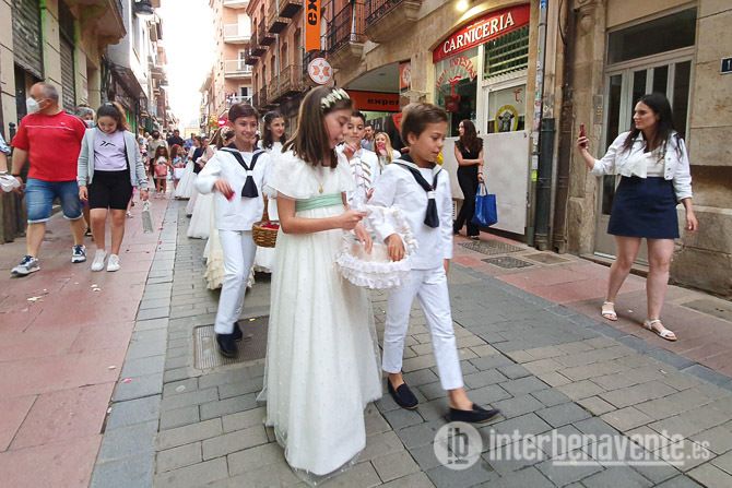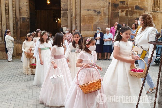 Una veintena de niños y niñas con sus trajes de comunión abrian esta procesión del Corpus Cristi, festividad históricamente vinculada a las fiestas del Toro Enmaromado, pero que este año ha dejado de figurar como parte de la programación oficial de estas fiestas.