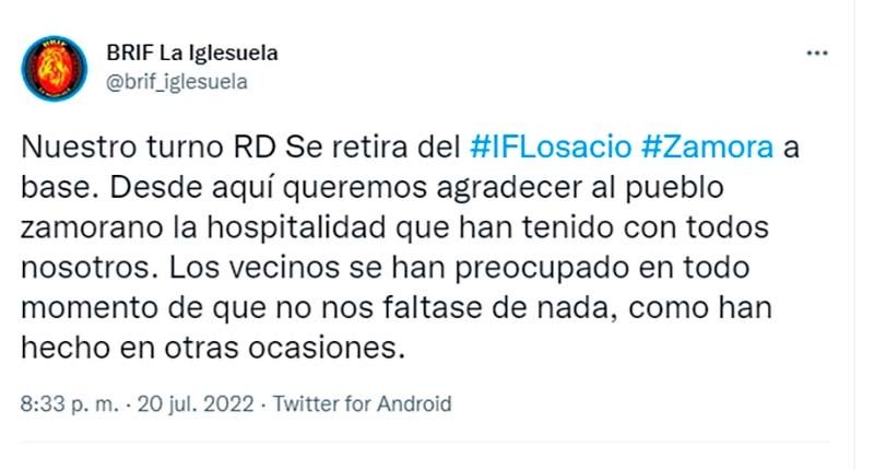 Esta tarde la Brigada de Refuerzo en Incendios Forestales La Iglesuela ubicada en la provincia de Toledo ha anunciado su retirada del incendio de Losació con destino a su base y lo ha querido hacer agradeciendo la hospitalidad del pueblo zamoranos y de los vecinos que se han preocupado de cubrir las necesidades de las brigadas que han luchado contra las llamas.