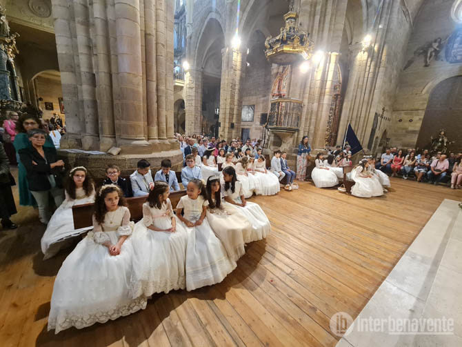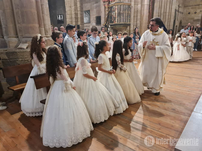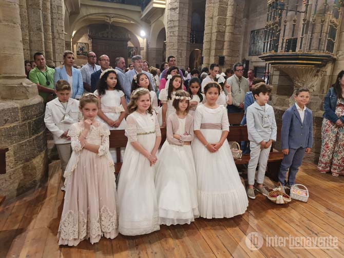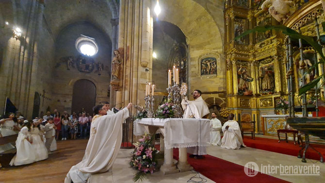 La celebración religiosa del Corpus, vinculada históricamente a la fiesta del Toro Enmaromado, se llevó a cabo en Benavente este domingo con una misa y la tradicional procesión a la que asisten los niños y niñas de primera comunión