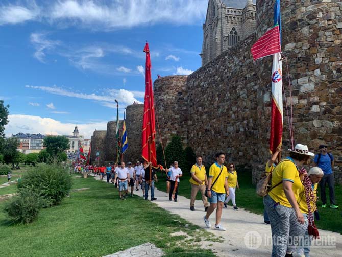 Con una puntualidad casi británica, la Asociación de Pendoneros de León dio inicio al evento a las seis de la tarde, en el paseo de las murallas romanas de Astorga. Más de treinta pendones recorrieron los casi seis kilómetros que separan estas dos localidades. Acompañados por sus respectivas charangas, los pendones desfilaron bajo la sombra de las milenarias murallas, el imponente palacio de Gaudí y la majestuosa Catedral gótica astorgana, para luego emprender el camino hacia Brimeda.