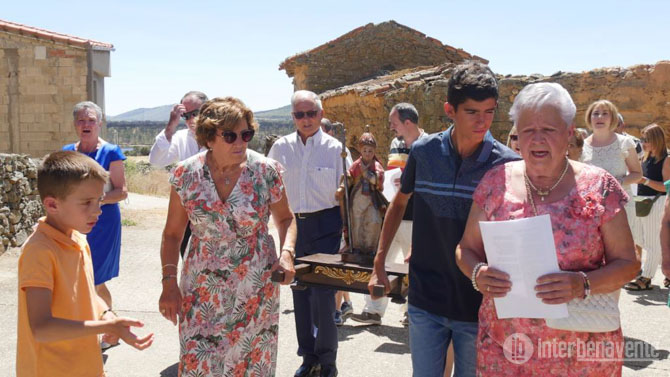 A la finalización de la misa le siguió el canto del himno del Santo que se repetiría durante toda la procesión por las calles de Villar, cuyas gentes de todas las edades portaban orgullosas a su Santo como un signo de resistencia a la despoblación y a la pérdida de identidad de un pueblo del camino jacobeo cuyos peregrinos hemos podido ver transitar por sus calles.