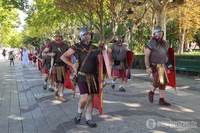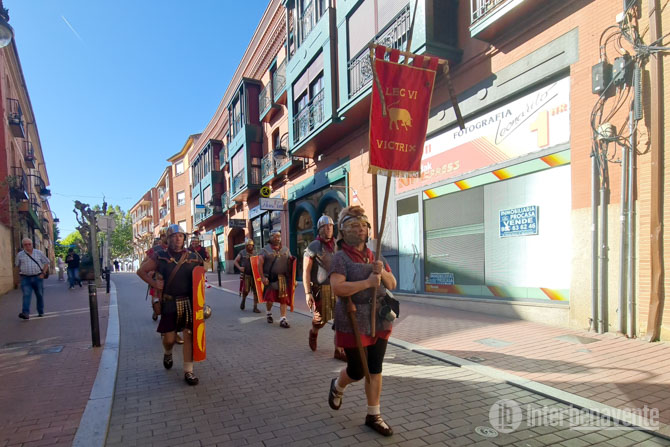 A las 12:30 horas una centuria romana de la Legión VI se aproximaba por los Paseos de la Mota, lugar donde se pronunciaba el discurso de bienvenida por parte del Primer Teniente Alcalde Eugenio Blanco, ataviado con la indumentaria bélica de los emperadores o centuriones romanos.