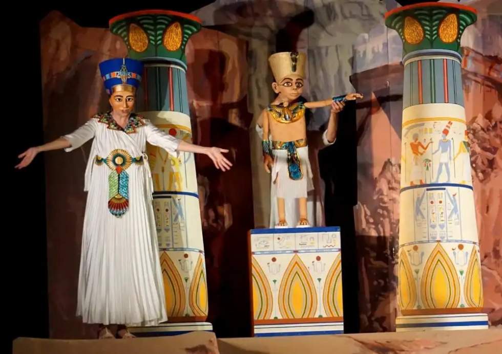 El espectáculo cuenta con una escenografía de tamaño medio-grande, muy dinámica, que pasa de representar el Valle de los Reyes o la tumba de Tutankamón, a diversos escenarios del Egipto antiguo.