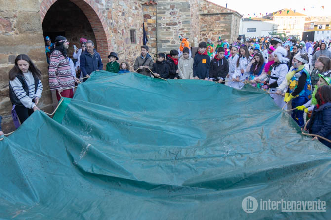 Como es tradición, los quintos subieron al campanario con la cabra simulada, mientras tanto un grupo formado por vecinos de todas las edades, principalmente jóvenes, sujetaban una gran lona verde, hacía la que se lanzó la cabra desde el campanario, recordando un polémico evento que se celebró hasta el año 2000, pero que ha seguido celebrándose como acto central de las fiestas, con cabras de peluche y otros materiales.