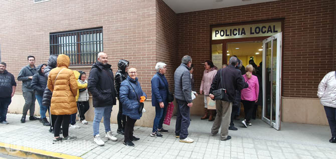 Una larga fila de personas esperaban en las inmediaciones del cuartel de la Policía Local a primera hora de la mañana para recoger los típicos Pan de la Veguilla. Un pan blanco que lleva impreso el logo de la Virgen de la Vega.