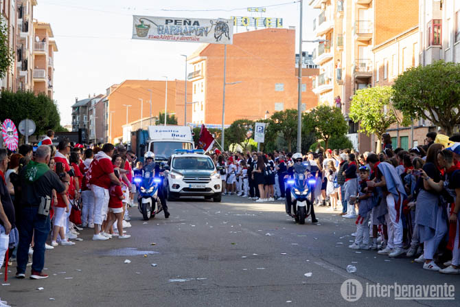 Se hicieron desear y las peñas ya comenzaban a impacientarse, fue cerca de las 19:45 horas cuando la Policía Local advertía a las peñas de la entrada del camión con los cajones donde se transportaba a los astados. Haciendo un pasillo las peñas los recibían con aplausos y vítores al igual que las numerosas personas que acudieron a Benavente esta tarde.