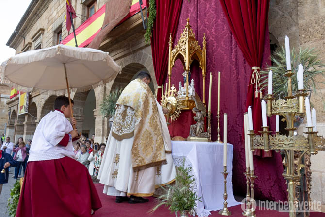 Los organizadores han instalado un altar efímero en honor de la eucaristía en la fachada del edificio del ayuntamiento de la Plaza Mayor, presidido por una copia de la imagen de la Virgen de la Vega. Desde el mismo se impartió la bendición con el Santísimo Sacramento.