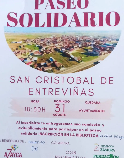 Las inscripciones para este Paseo Solidario a beneficio de AZAYCA se harán en la Biblioteca de San Cristóbal de Entreviñas, del 26 al 30 de agosto, pagando un sonativo de 5 euros.