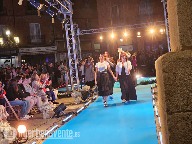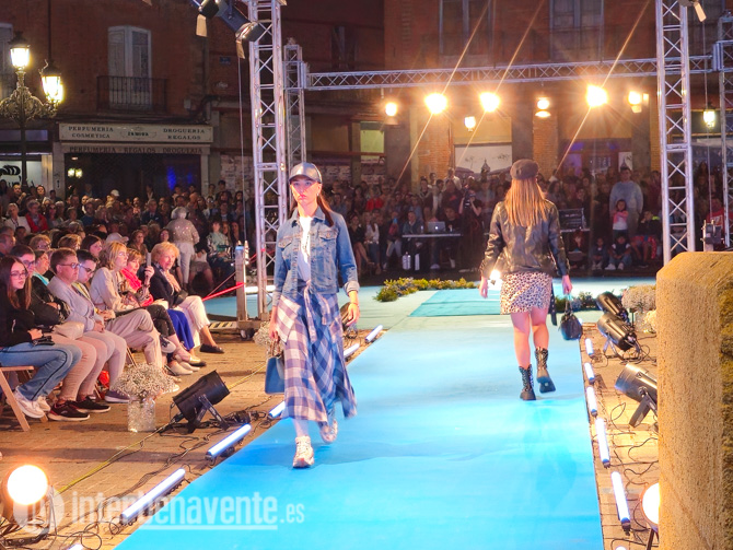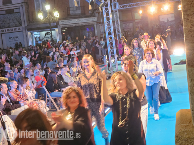 La Plaza Mayor se convertía en una auténtica pasarela de moda, pisando una alfombra azul se alzaba una gran estructura de focos que servían para iluminar el camino de los y las modelos que han lucido la ropa, zapatos y complementos del comercio de Benavente ante un numeroso público que consiguió llenar las más de 300 sillas dispuestas que acotaban el lugar de la zona de la pasarela.