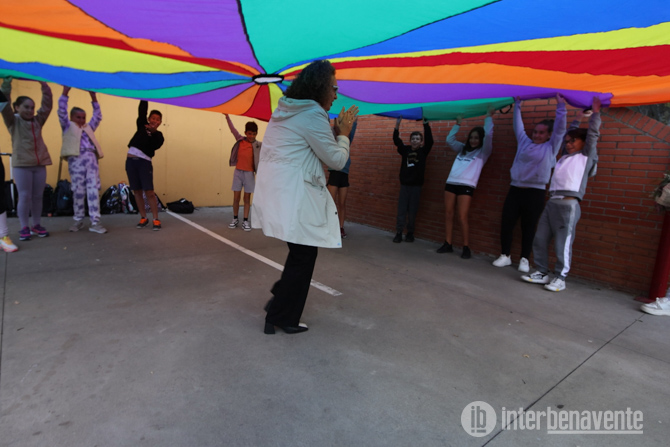 Después de las palabras de María, Mari Ángeles fue conducida por el patio entre los alumnos y bajo los paracaídas, donde la esperaba una alumna con un ramo de flores. Visiblemente emocionada, Mari Ángeles se dirigió nuevamente a las escaleras de entrada y compartió unas palabras, mostrando a todos su agradecimiento.