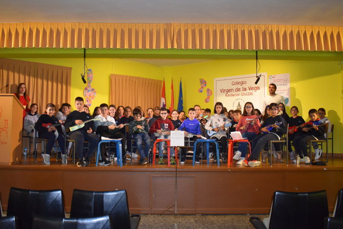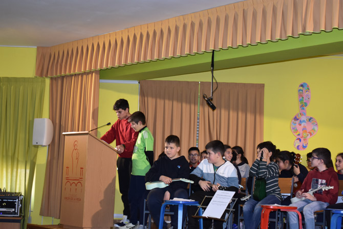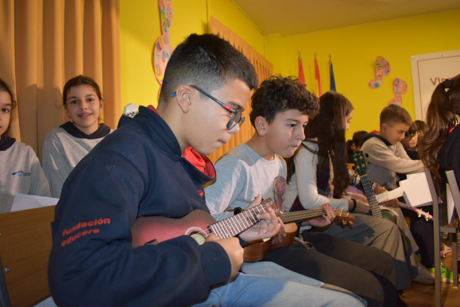 Tras la narración de los cuentos, los alumnos de 5º y 6º de Primaria, junto con los de 2º de ESO, interpretaron una canción utilizando el ukelele. Esta actuación fue especialmente significativa, ya que los alumnos de Infantil, convertidos en entusiastas espectadores, aplaudieron y animaron a sus compañeros con gran entusiasmo.