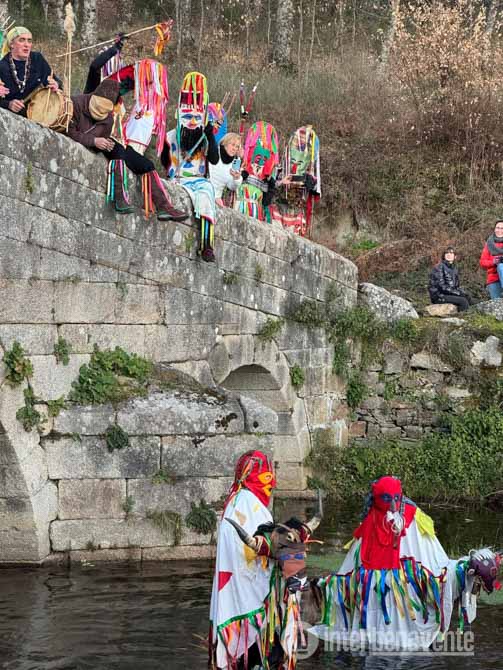 La comitiva avanzó al son de gaitas y tamboriles, recorriendo las calles del pueblo y llevándose consigo el ánimo de vecinos y curiosos. El momento culminante tuvo lugar en el puente de Vigo de Sanabria, donde las talanqueiras, grandes y pequeñas, se internaron en el río, azuzadas por los gritos del resto de personajes.