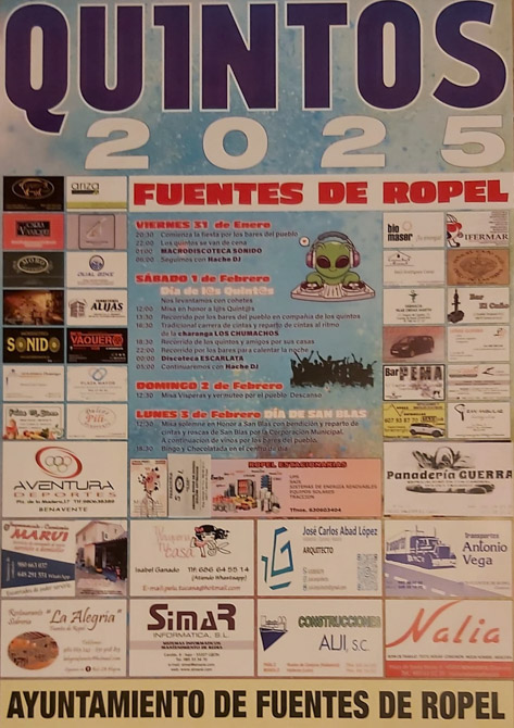 El sábado arrancará con el tradicional lanzamiento de cohetes para anunciar el Día de l@s Quint@s. A las 12:00, se celebrará una misa en honor a los quintos. Después, a las 13:30, comenzará un recorrido por los bares del pueblo acompañados por los quintos.