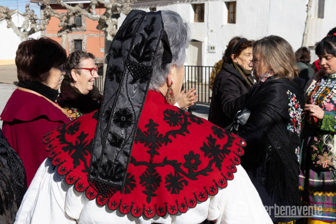 La celebración comenzó a las 12 de la mañana en la Plaza del pueblo, donde las mujeres, y también algunos niños y niñas, ataviadas con los trajes típicos y mantones, fueron llegando para dar inicio a una jornada llena de música, danza y actos simbólicos. La música de una dulzaina y el tamboril animaba el ambiente.