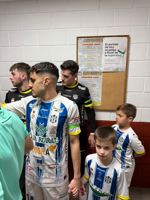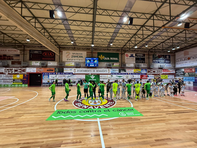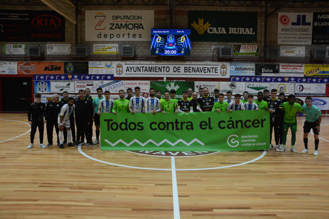 Los equipos del Atlético Benavente Fs que disputaban el sábado sus jornadas competitivas en La Rosaleda daban visibilidad a la lucha por la investigación contra el cáncer dentro de la campaña que la aecc “El partido de hoy se juega a favor de la esperanza”.