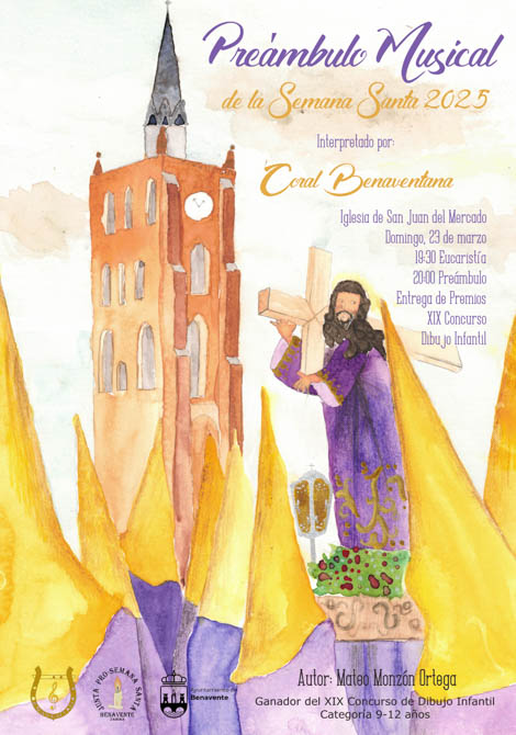 El domingo 23 de marzo, a las 20.00 horas, después de la celebración de la Santa Misa, en la Iglesia de San Juan del Mercado, tendrá lugar el Preámbulo Musical de la Semana Santa 2025, que será a cargo de la Coral Benaventana y, a continuación, será la entrega del premios del XIX Certamen de Dibujo Infantil.