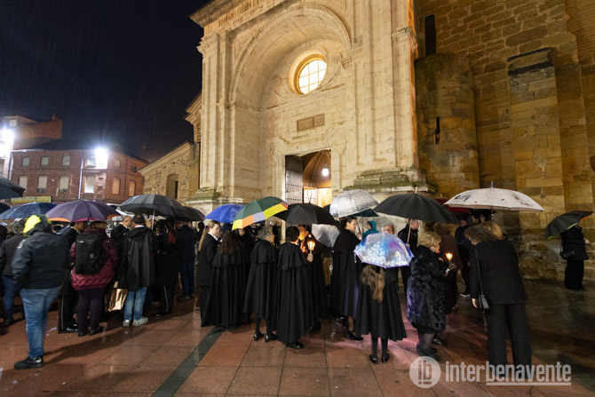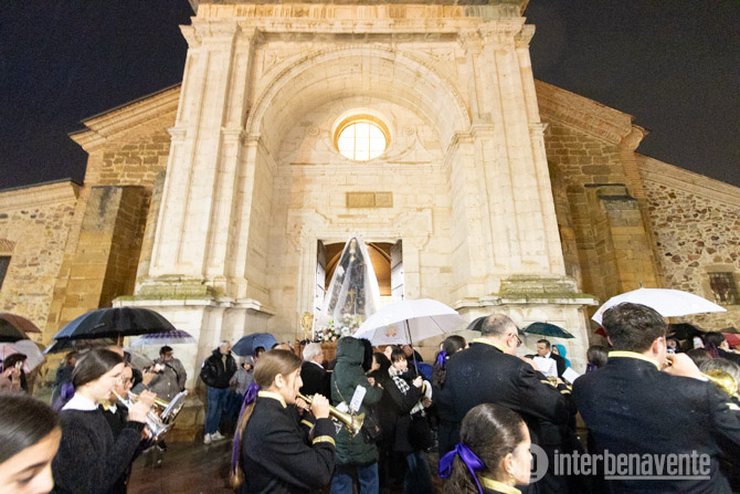 Luis Antonio Pedraza abría la procesión tal y como estaba previsto, seguido por la Banda de Cornetas y Tambores de La Bañeza, que fueron escoltados con paraguas por sus acompañantes y finalmente la imágen de la Virgen de los Dolores, cubierta con un plástico como símbolo de las ganas que tenían en la cofradía de realizar esta procesión, incluso con el mayor obstaculo que hoy podría suceder, una lluvia oportuna que parece nos va a visitar al menos los primeros días de esta Semana Santa.