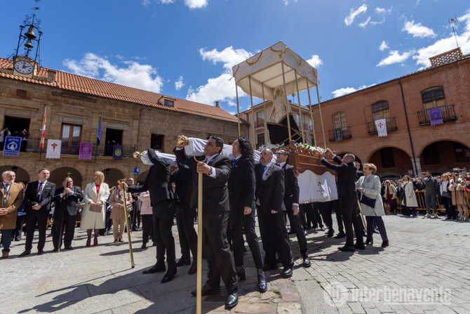 Tras la misa de Pascua, la imagen de la Virgen de las Angustias partía de la Iglesia de Santa María dirección a la Plaza Mayor, mientras que el paso del Cristo Resucitado esperaba a las puertas de la Iglesia de San Juan del Mercado para hacer su entrada en la Plaza Mayor de Benavente.