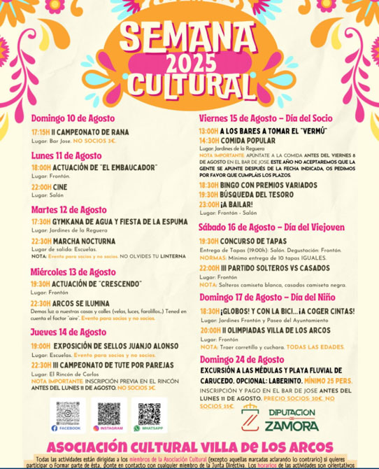 Todas las actividades están dirigidas a los miembros de la Asociación Cultural (excepto aquellas marcadas aclarando lo contrario) si quieres participar o formar parte de ésta, ponte en contacto con cualquier miembro de la Junta Directiva. Los horarios de las actividades son orientativos.